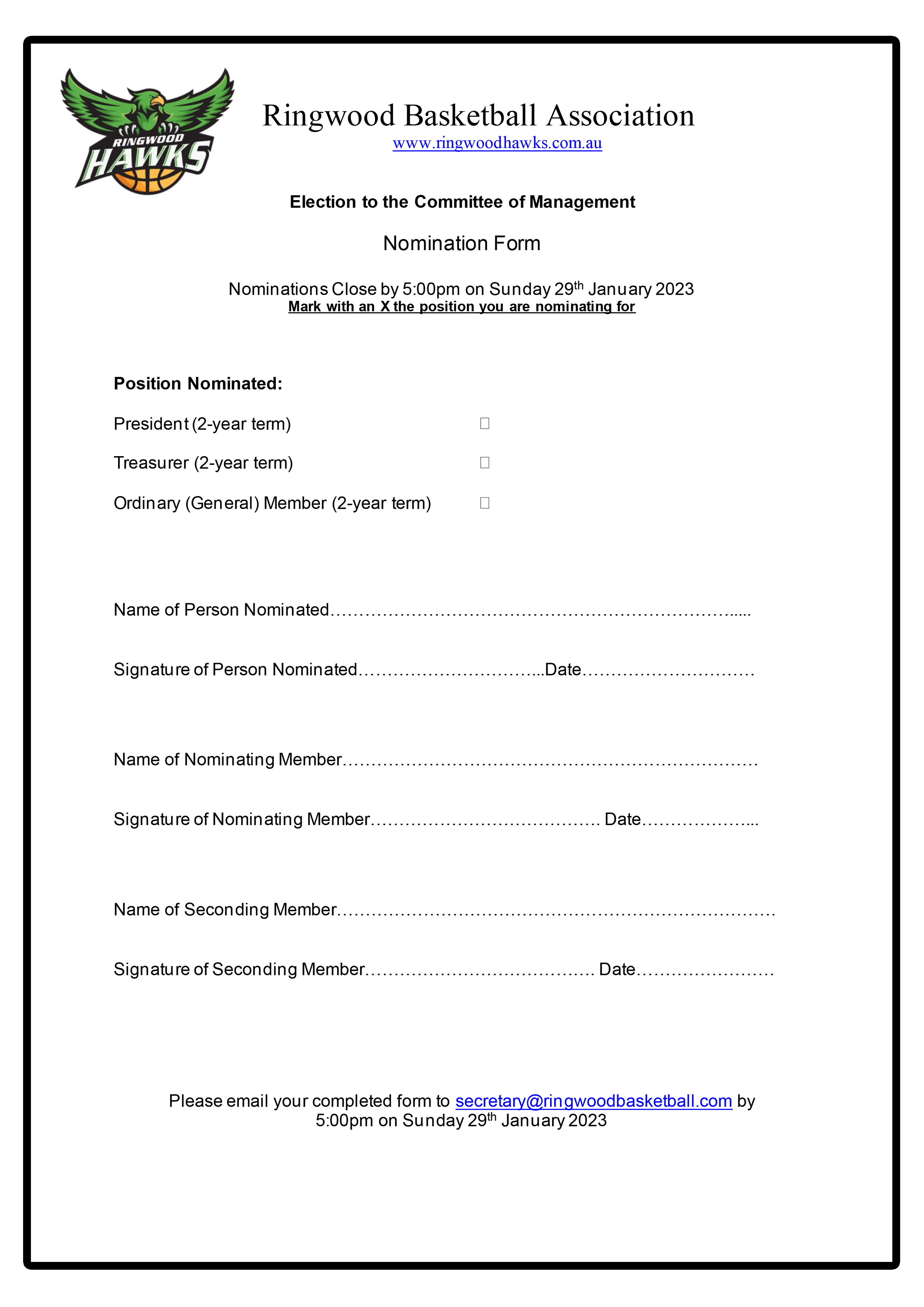 The Ringwood Basketball Association AGM is set for 6.30pm Monday February 6th at Norwood Secondary College. Nomination form below.